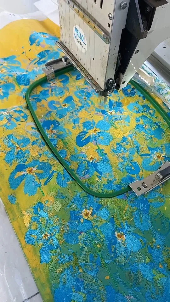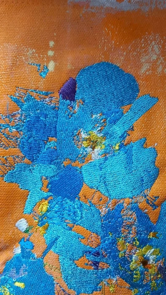The flowers have now begun to change in shape, full petals now start blending into the background. As with the first panel, the background changed from red to yellow. This background now changes from yellow to green to blue, to represent time passing. Towards the bottom of the painting the embroidery starts getting lost in the background representing the beginning of a blurred reality.