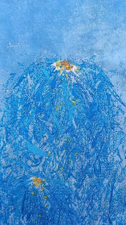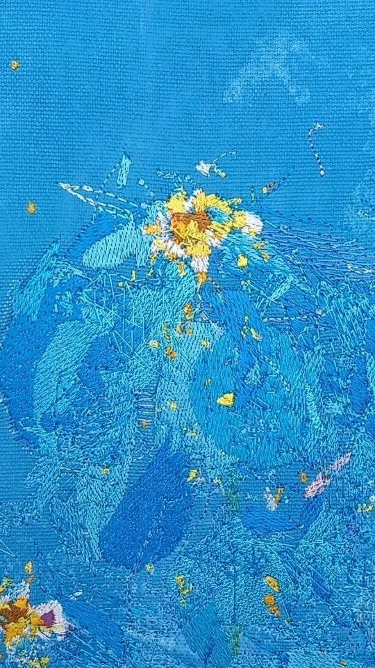 As time passes, the blue background progresses to white, you begin to see just how fractured the flowers have become. This specific piece took over 4 months to draw and a month and a half to embroider. Every stitch line has been hand placed.